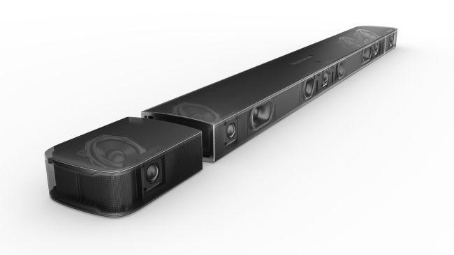 Это похоже на одну звуковую панель и саб, но это нечто похожее на игрушку-трансформер. Снимите два конца планки и разместите их сзади и сбоку от места для сидения, и они станут выделенными, по-настоящему беспроводными задними динамиками с питанием от батареи в системе объемного звучания. Это то, что Optimus Prime может иметь дома.