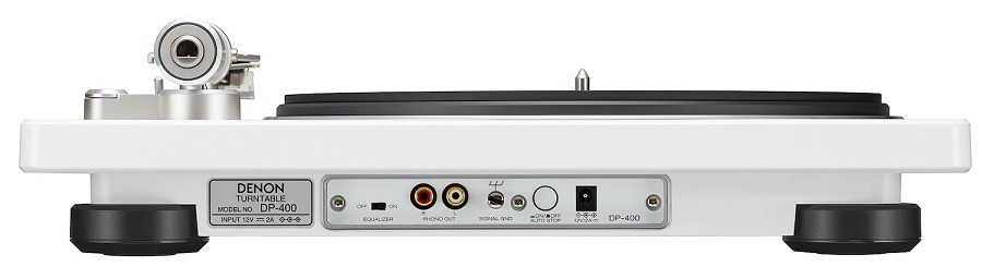 Цоколь из МДФ, покрытый черным или белым глянцевым лаком, скрывает нижний корпус, в котором находятся двигатель, электроника и разъемы RCA. Алюминиевый плато с толстым резиновым ковриком частично утоплен в цоколе с алюминиевой окантовкой, что придает элегантный вид. Конструкция опирается на четыре твердые ножки. Благодаря своему весу 5,8 кг, включая пылезащитную крышку, DP-400 дает понять, что с его тонким и элегантным дизайном это довольно прочный проигрыватель.